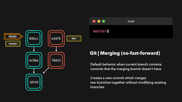 而当我们使用 no-fast-forward 模式,即在合并分支命令加入 --no-ff 后缀的方式运行时,便会生成一个新的提交记录
